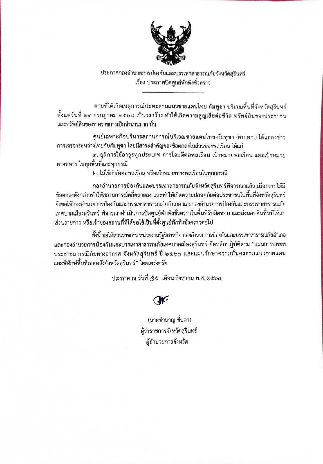 ตามที่ได้เกิดเหตุการณ์ปะทะตามแนวชายแดนไทย-กัมพูชา บริเวณพื้นที่จังหวัดสุรินทร์ ตั้งแต่วันที่ 24 กรกฎาคม 2568 เป็นวงกว้าง ทำให้เกิดความสูญเสียต่อชีวิต ทรัพย์สินของประชาชนและทรัพย์สินของทางราชการเป็นจำนวนมาก นั้น