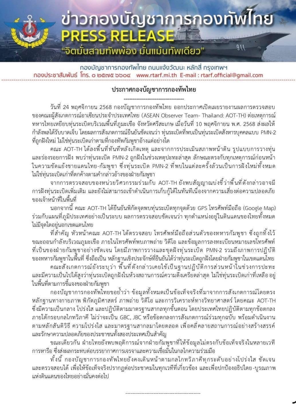 วันที่ 24 พฤศจิกายน 2568 กองบัญชาการกองทัพไทย ออกประกาศเปิดเผยรายงานผลการตรวจสอบของคณะผู้สังเกตการณ์อาเซียนประจำประเทศไทย (ASEAN Observer Team- Thailand: AOT-TH) ต่อเหตุการณ์ทหารไทยเหยียบทุ่นระเบิดบริเวณพื้นที่ภูมะเขือ จังหวัดศรีสะเกษ เมื่อวันที่ 10 พฤศจิกายน พ.ศ. 2568 ส่งผลให้กำลังพลได้รับบาดเจ็บ โดยผลการสังเกตการณ์ยืนยันชัดเจนว่า ทุ่นระเบิดที่พบเป็นทุ่นระเบิดสังหารบุคคลแบบ PMN-2 ที่ถูกฝังใหม่ ไม่ใช่ทุ่นระเบิดเก่าตามที่กองทัพกัมพูชาอ้างแต่อย่างใด