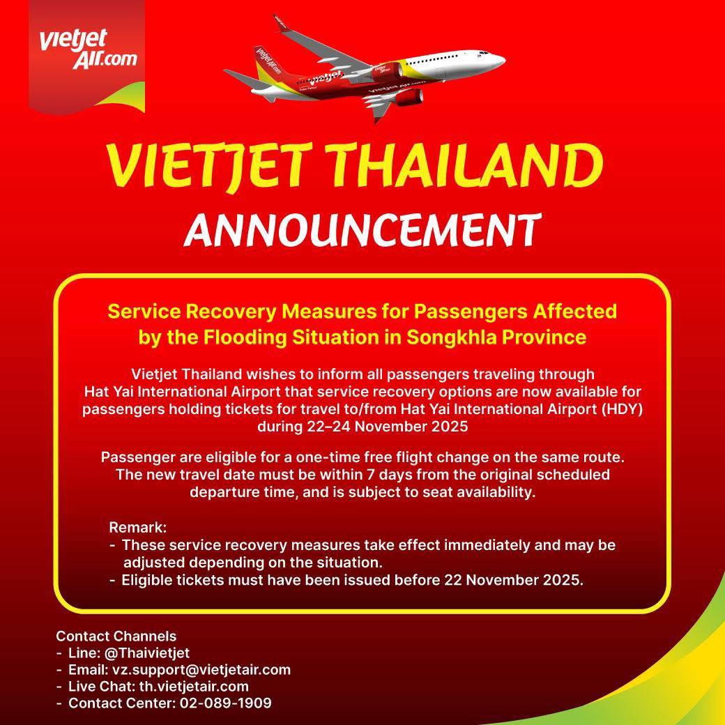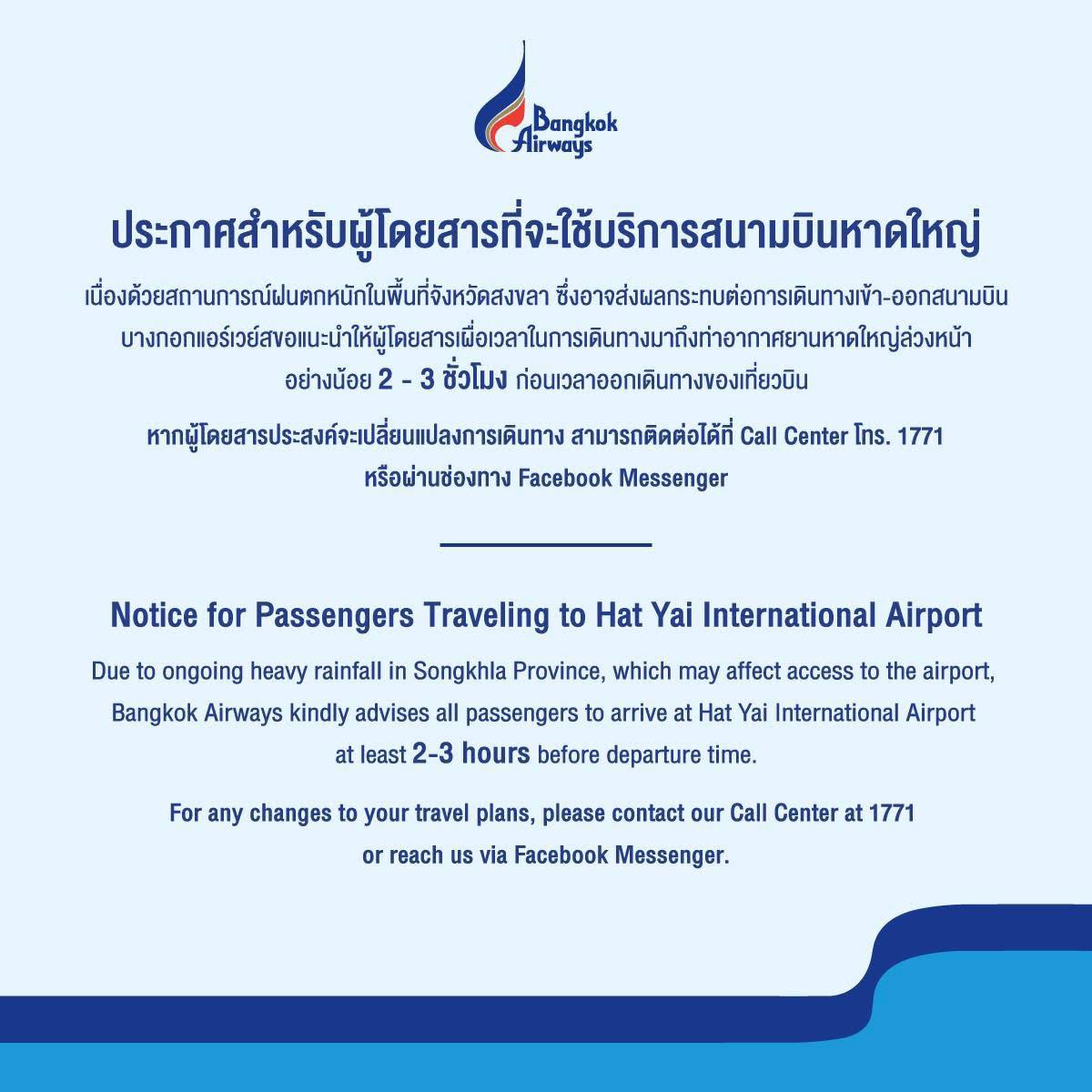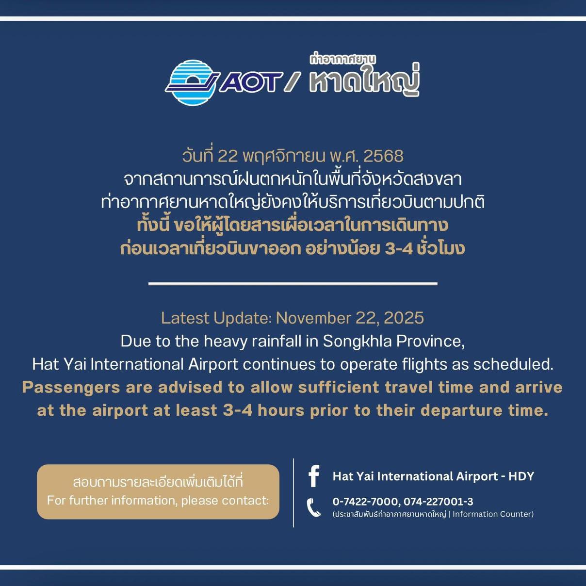 Hat Yai International Airport remains fully operational, with runway services functioning normally. The airport continues to provide updates through its official channels. ✈️