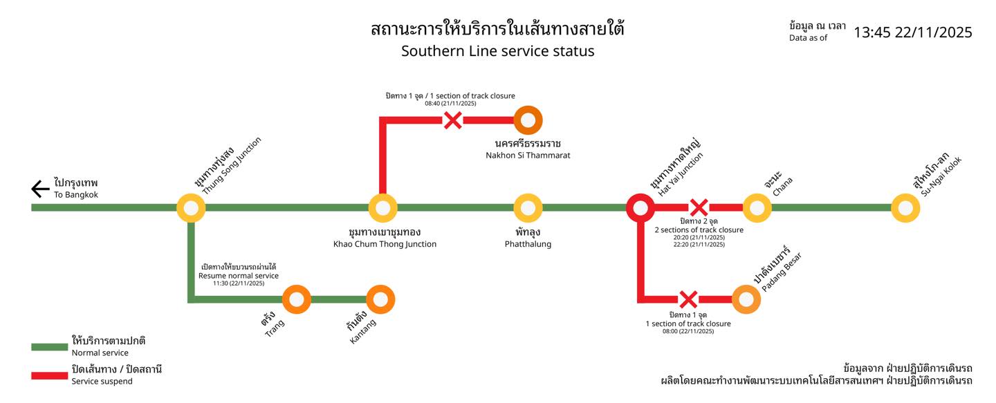 The State Railway of Thailand has suspended 10 southbound trains due to flood-damaged tracks.