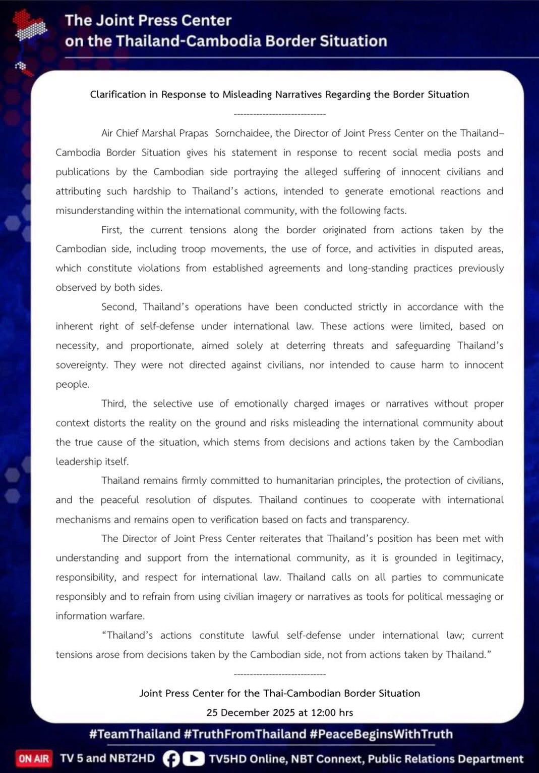 Clarification in Response to Misleading Narratives Regarding the Border Situation, Joint Press Center for the Thai-Cambodian Border Situation, 25 December 2025, 12.00 hr.