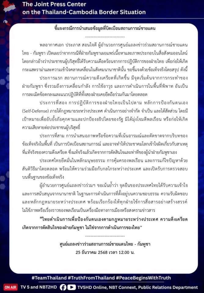 ศูนย์แถลงข่าวร่วมสถานการณ์ชายแดนไทย - กัมพูชา ชี้แจงกรณีการนำเสนอข้อมูลที่บิดเบือนสถานการณ์ชายแดน วันที่ 25 ธันวาคม 2568 เวลา 12.00 น.