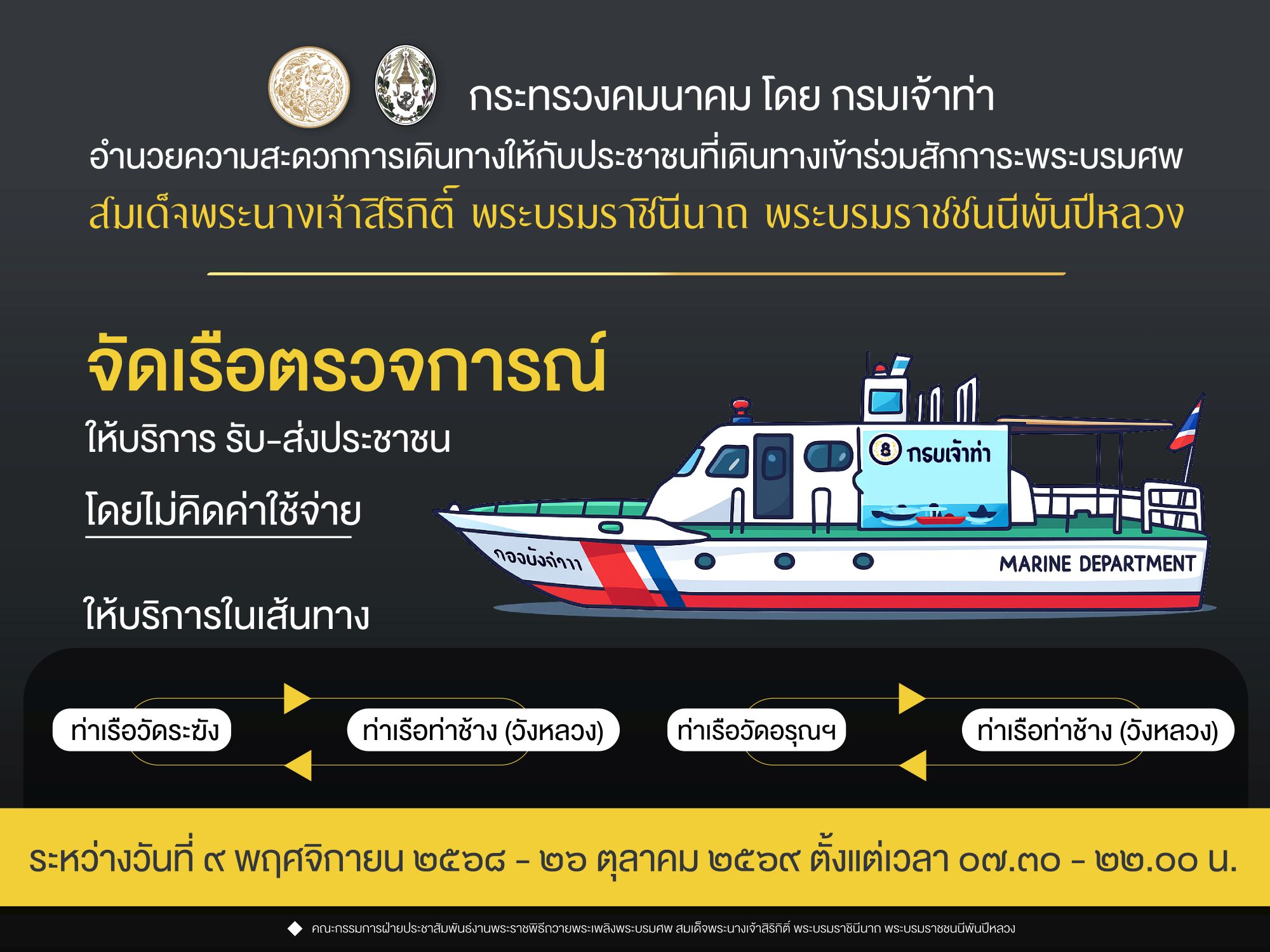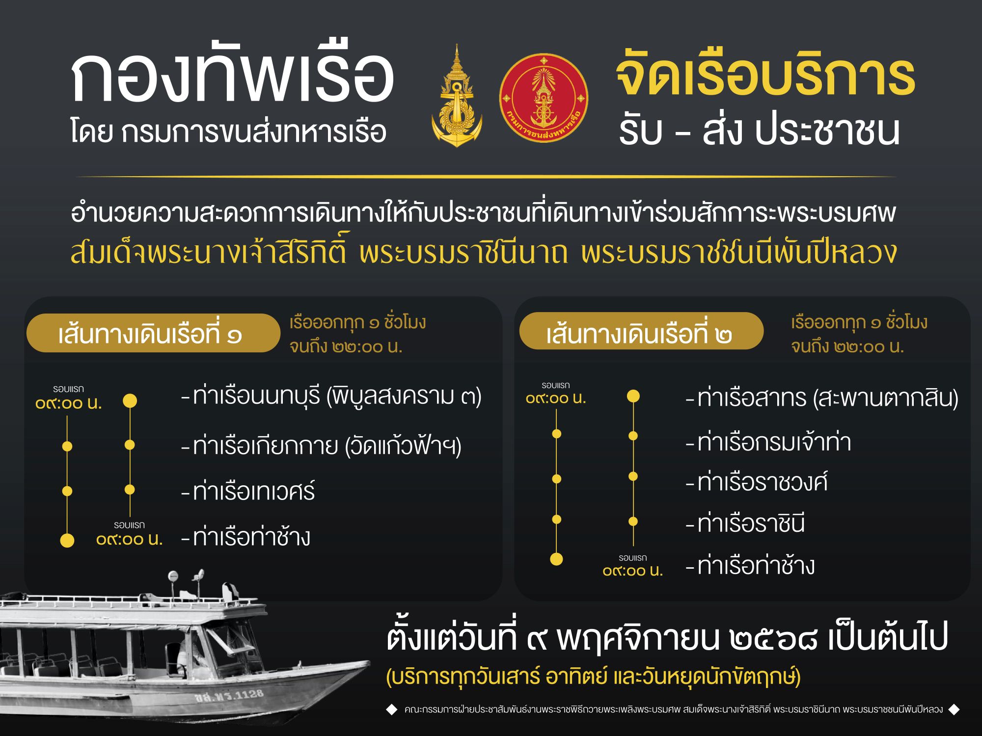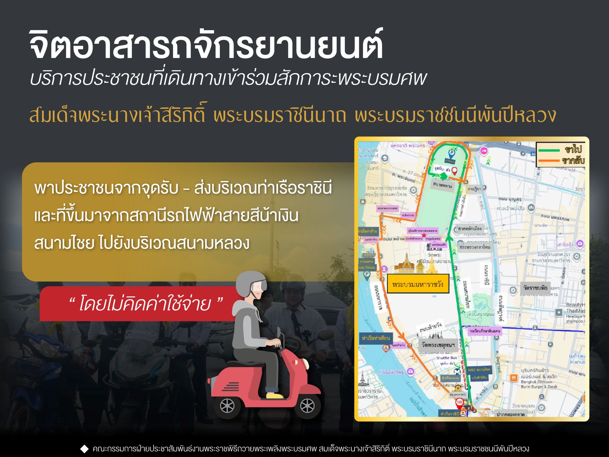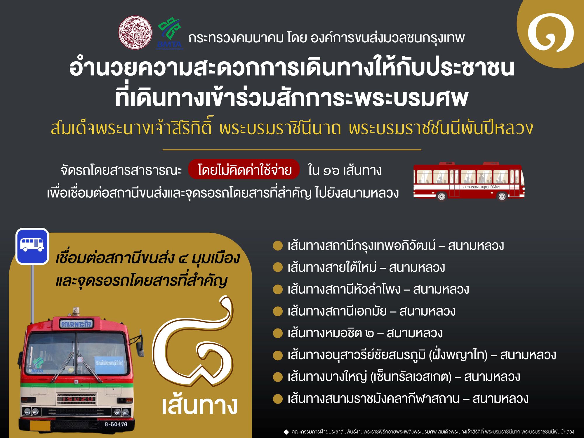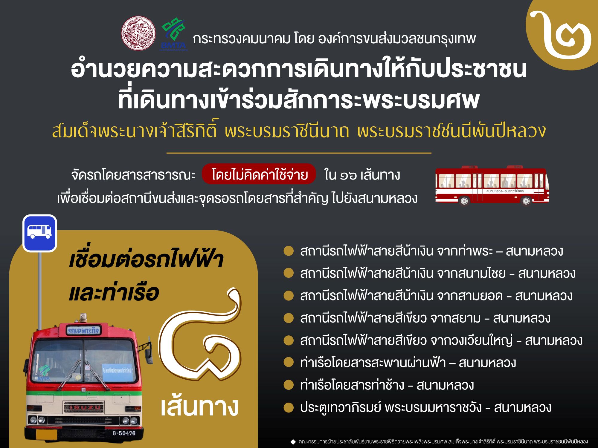 รัฐบาลอำนวยความสะดวกการเดินทางให้กับประชาชนที่เดินทางเข้าร่วมสักการะพระบรมศพ สมเด็จพระนางเจ้าสิริกิติ์ พระบรมราชินีนาถ พระบรมราชชนนีพันปีหลวง โดยจัดบริการขนส่งสาธารณะประเภทต่างๆ เชื่อมต่อสถานีขนส่งและจุดรอรถโดยสารที่สำคัญ ไปยังสนามหลวง เริ่มให้บริการตั้งแต่วันที่ ๙ พฤศจิกายน ๒๕๖๘ เป็นต้นไป