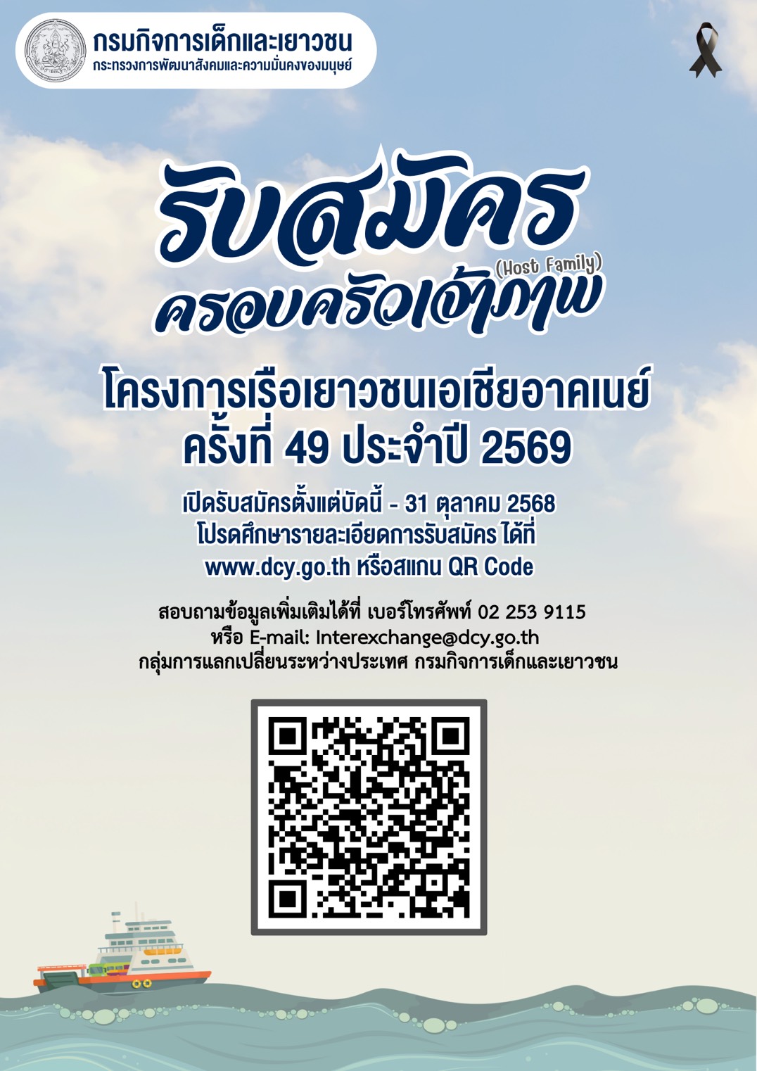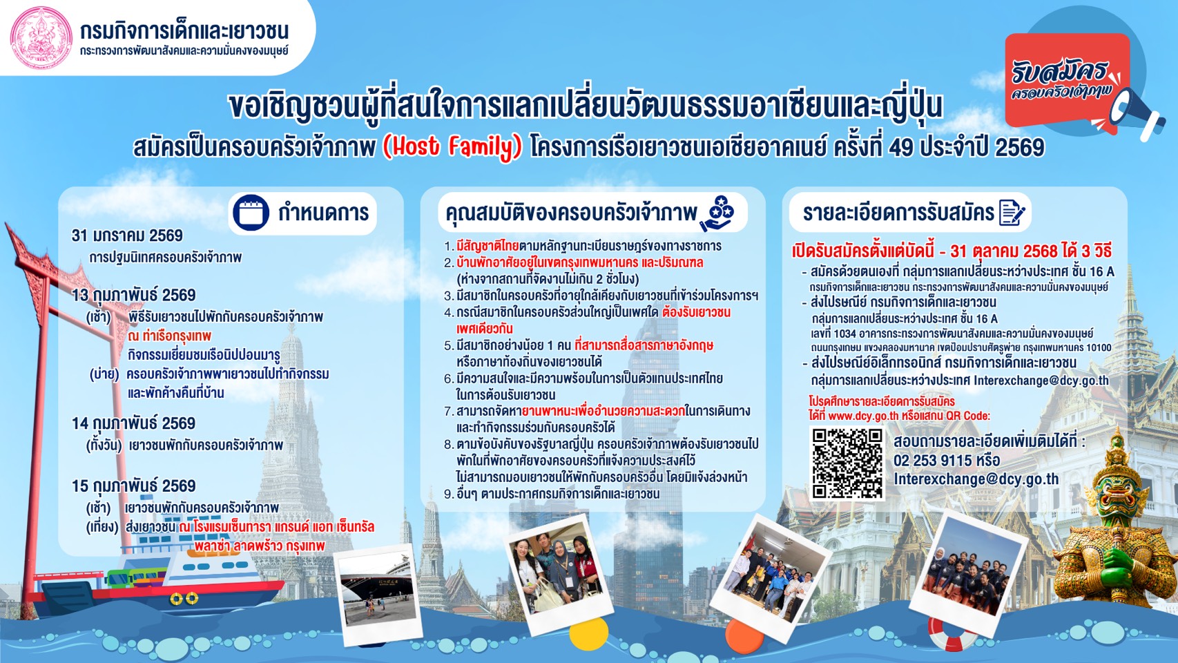 ประชาสัมพันธ์รับสมัครครอบครัวเจ้าภาพ โครงการเรือเยาวชนเอเชียอาคเนย์ ครั้งที่ 49 ประจำปี 2569
