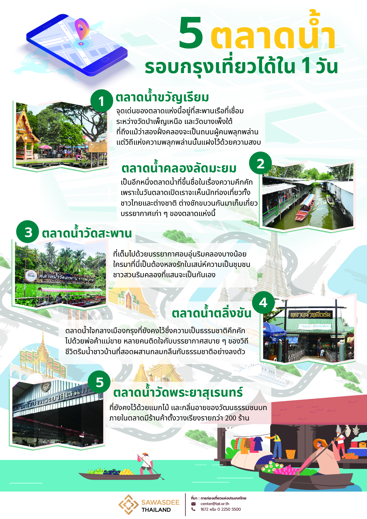 ตลาดน้ำ ถือเป็นแหล่งท่องเที่ยวเชิงอนุรักษ์ เพราะคนส่วนใหญ่ชอบความเรียบง่าย และความสงบจากวิถีชีวิตริมน้ำ ทั้งยังสร้างความเพลิดเพลินใจในการจับจ่ายซื้อของ แถมยังไม่ต้องเดินทางไปต่างจังหวัด เพราะแค่ในกรุงเทพฯ ก็มีตลาดน้ำให้เลือกเดินมากมาย วันนี้เรานำ 5 สถานที่ท่องเที่ยวตลาดน้ำในกรุงเทพมาแนะนำ สำหรับคนที่มีแผนอยากไปสัมผัสบรรยากาศแบบเรียบง่าย