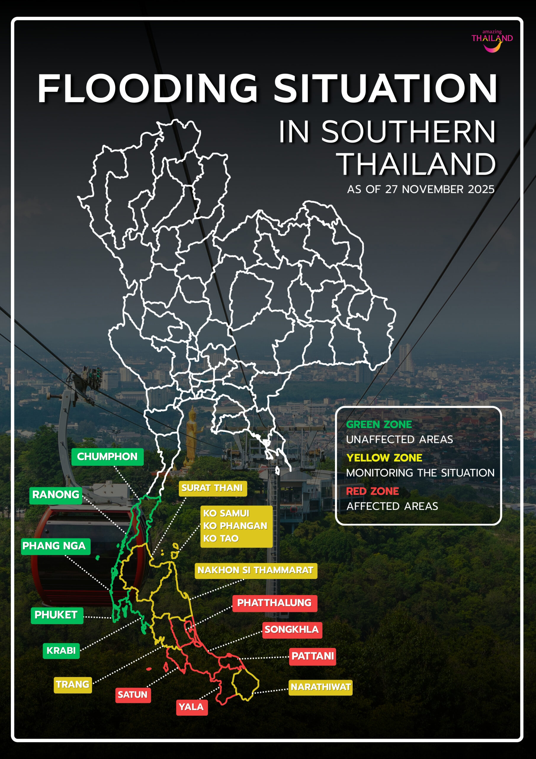 The Tourism Authority of Thailand (TAT) understands that the ongoing weather conditions in parts of Southern Thailand may cause concern for travellers. While many destinations continue to offer tourism experiences as normal, heavy rainfall, flash floods, and strong waves are still being reported in several provinces. This has resulted in temporary adjustments to some transport services and safety-related closures at selected natural attractions. Airports across the region remain operational, with limited delays and occasional disruptions to local ground transfers.