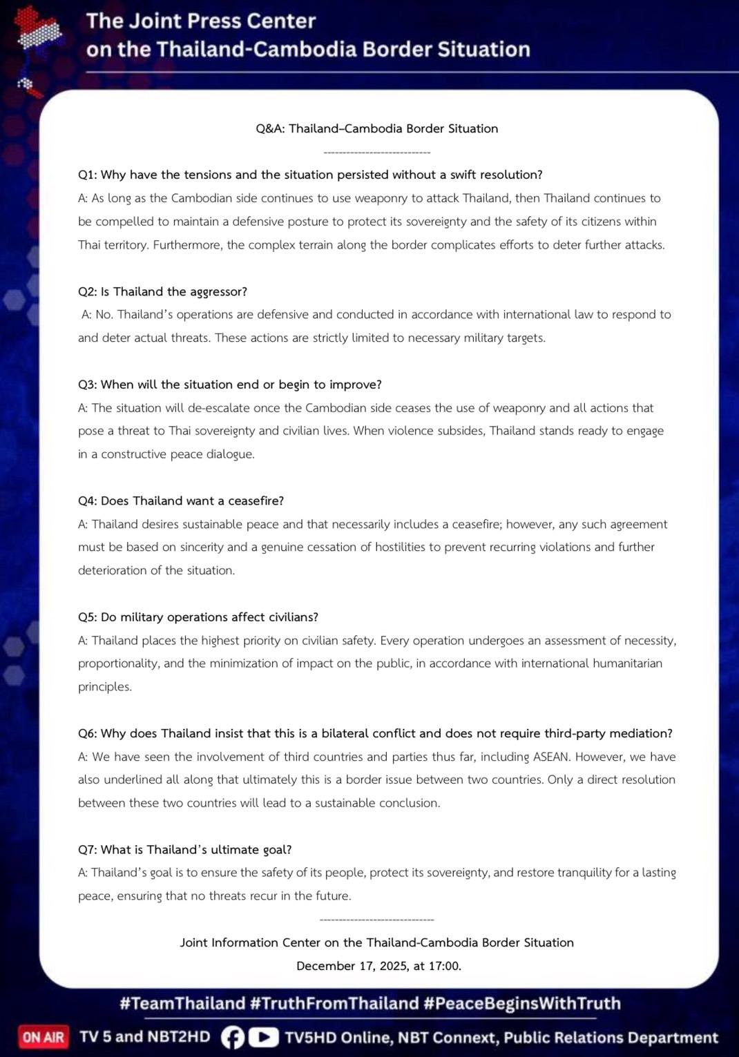 Q&A: Thailand-Cambodia Border Situation, Joint Information Center on the Thailand-Cambodia Border Situation, 17 December 2025, 17.00 hr.