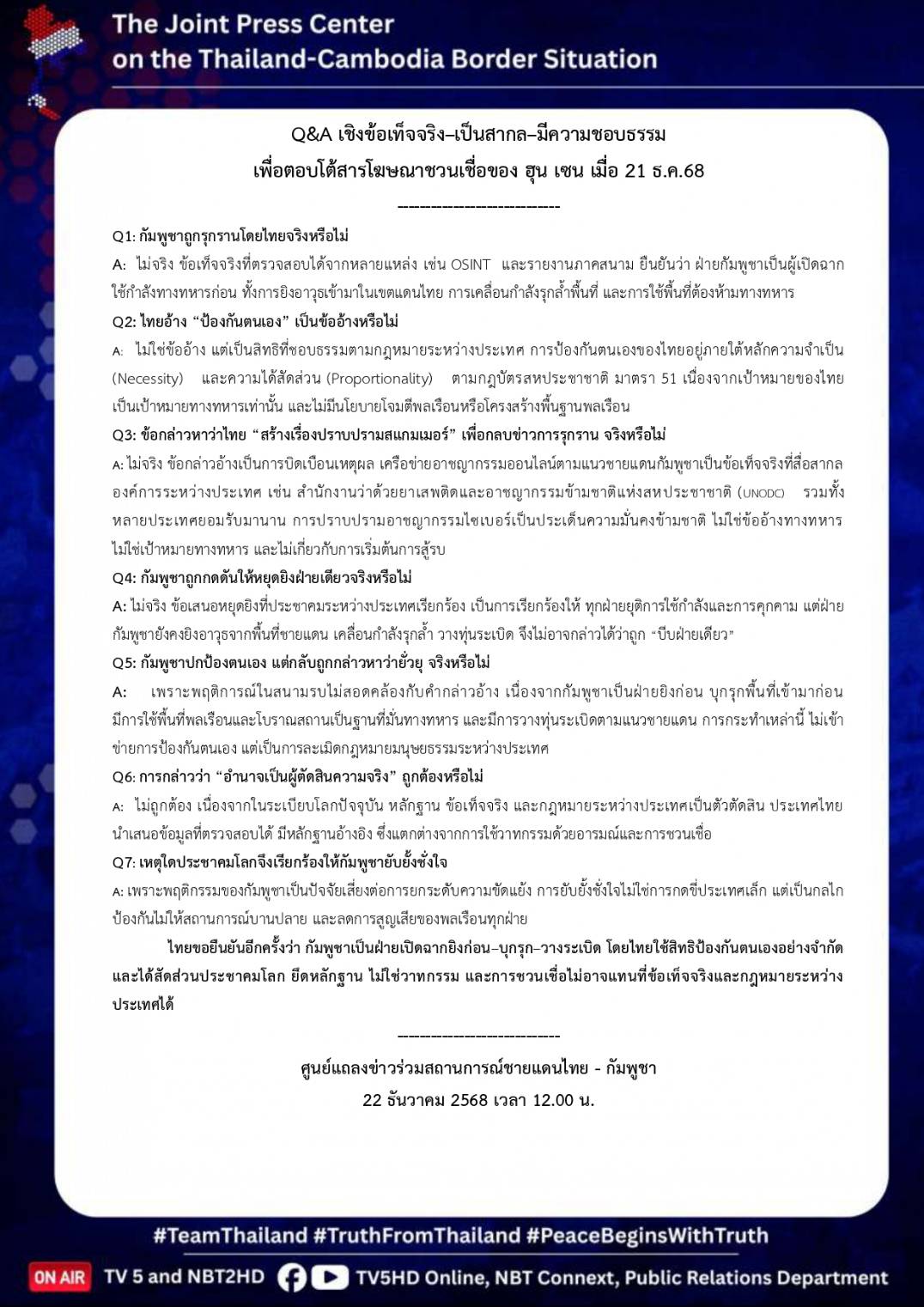 Q&A เชิงข้อเท็จจริง–เป็นสากล–มีความชอบธรรม เพื่อตอบโต้สารโฆษณาชวนเชื่อของ ฮุน เซน เมื่อ 21 ธ.ค.68 ศูนย์แถลงข่าวร่วมสถานการณ์ชายแดนไทย-กัมพูชา