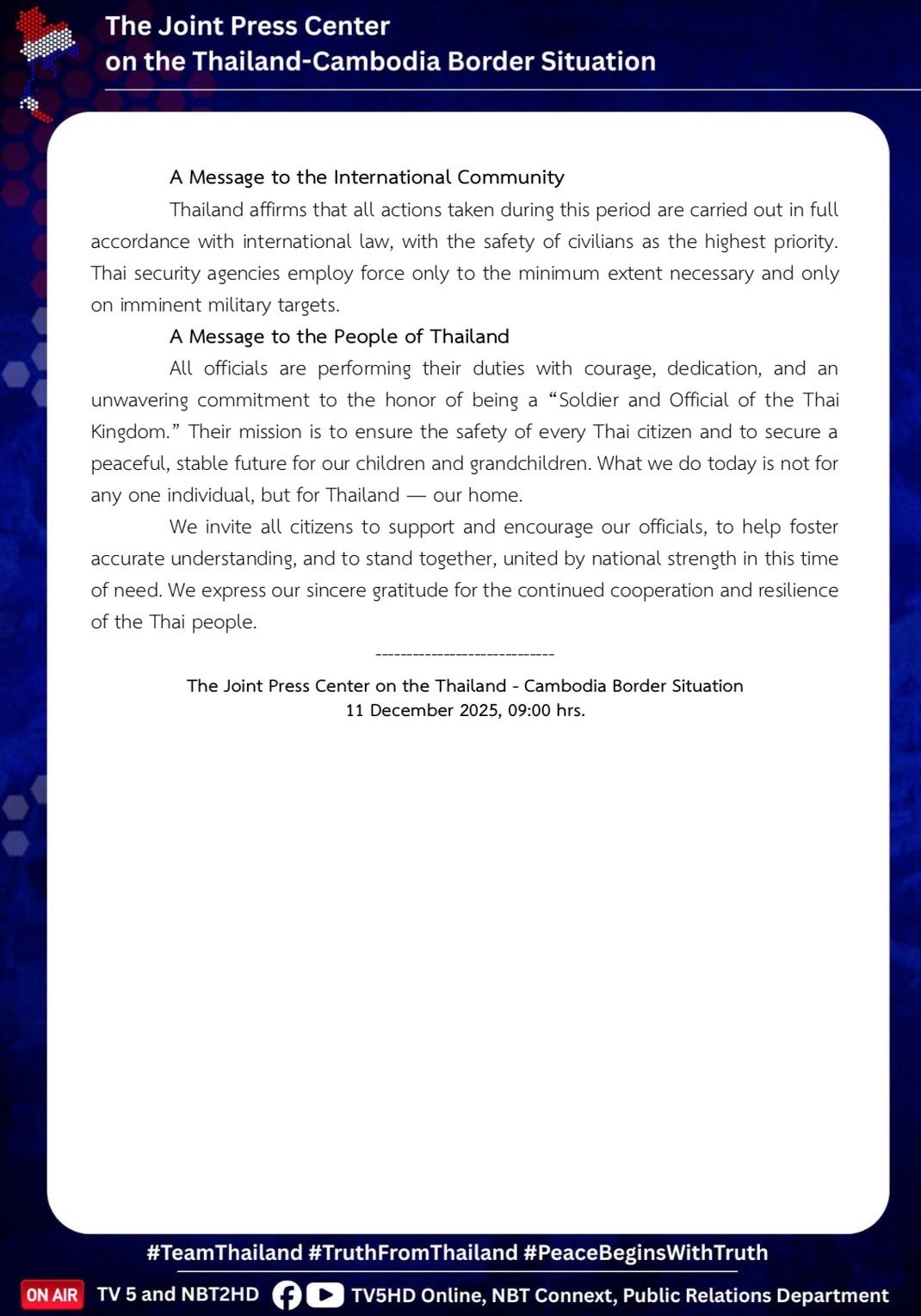 Source: The Joint Press Center on the Thailand-Cambodia Border Situation, 11 December 2025, 10.00 hr.