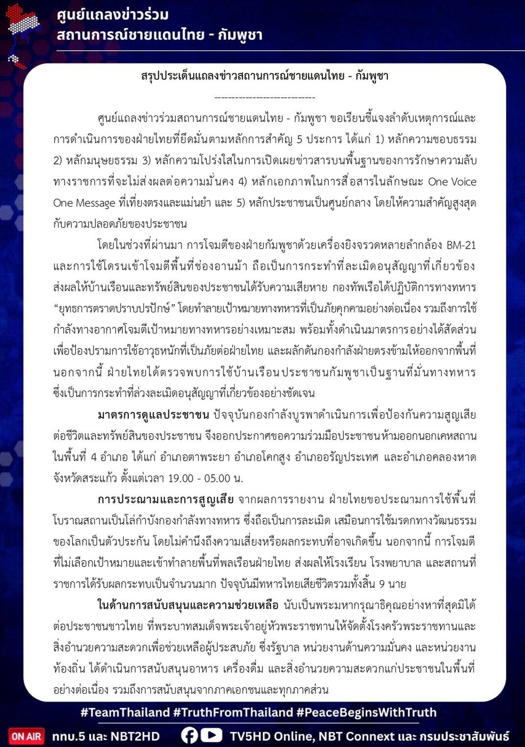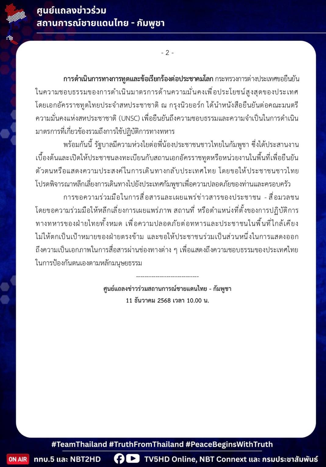 ที่มา สรุปประเด็นแถลงข่าวสถานการณ์ชายแดนไทย - กัมพูชา ศูนย์แถลงข่าวร่วมสถานการณ์ชายแดนไทย - กัมพูชา ประจำวันที่ 11 ธันวาคม 2568 เวลา 10.00 น.