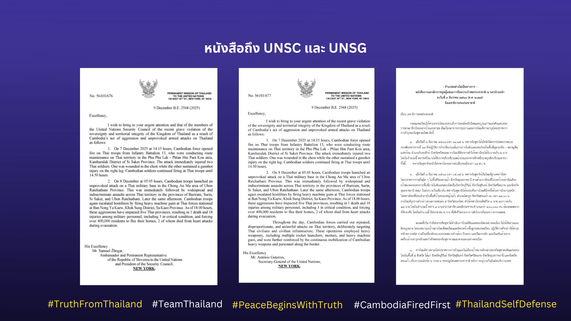 เพื่อยืนยันในความชอบธรรมของการดำเนินมาตรการด้านความมั่นคงเพื่อประโยชน์สูงสุดของประเทศ กระทรวงการต่างประเทศ โดยเอกอัครราชทูตไทยประจำสหประชาชาติ ณ กรุงนิวยอร์ก ได้นำหนังสือยืนยันต่อคณะมนตรีความมั่นคงแห่งสหประชาชาติ (UNSC) เพื่อยืนยันถึงความชอบธรรมและความจำเป็นในการดำเนินมาตรการที่เกี่ยวข้องรวมถึงการใช้ปฏิบัติการทางทหาร