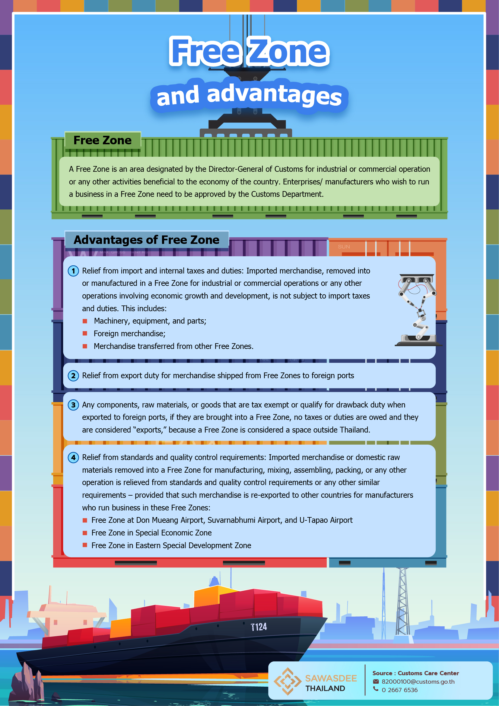 A Free Zone is an area designated by the Director-General of Customs for industrial or commercial operation or any other activities beneficial to the economy of the country. Enterprises and manufacturers who wish to run their business in a Free Zone need to obtain approval from the Customs Department.